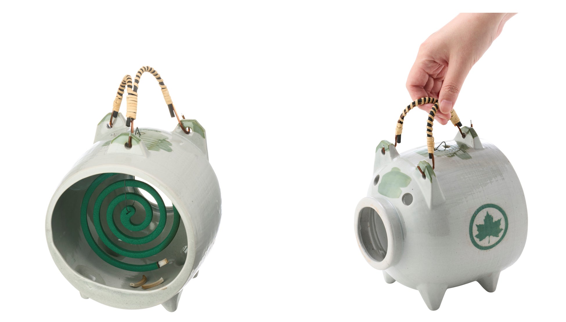 中のフックに市販の蚊取り線香を引っかけるだけで簡単に取り付けが完了し、使用する蚊取り線香に合わせて針金の長さや角度を調節することもできます。上部にはハンドルが付いているので持ち運びにも便利です。金属のハンドルは、籐(とう)をつるのように巻き付けた美しいデザインのほか、ぶたの表情や輪郭、模様なども職人の手でひとつひとつ丁寧に作られ、見た目にもたこだわっています。