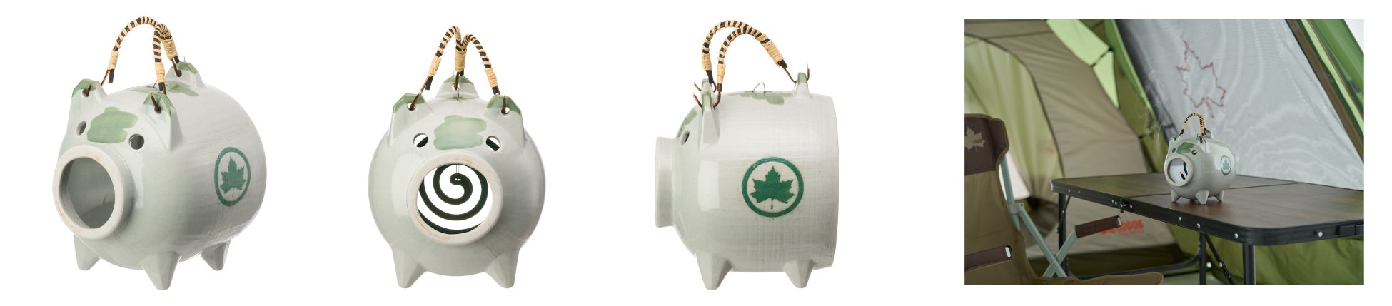 夏キャンプに蚊取り線香を取り入れることで、蚊の不快感なくキャンプが楽しめるほか、たちのぼる煙が風情ある夏を演出するので、自宅の縁側や庭先でも活躍する。ぶたの表情や輪郭、模様、ハンドルなども職人の手作業で丁寧に作られたこだわりのアイテム。