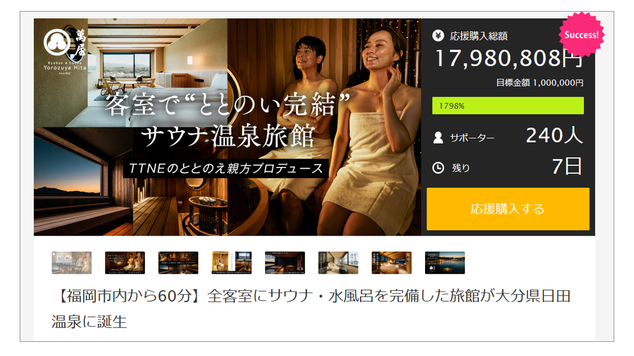 2月に開始した、Makuakeでの先行販売では、想定以上のご支援をいただき、ご用意した宿泊券203個が完売いたしました。クラウドファンディングは、5月9日(火曜)まで引き続き実施いたします。通常価格より30%OFFの2名まで利用可能な宿泊券を追加しております。現在、よろづやに宿泊するには、Makuakeの割引宿泊券をご購入頂くのが、断然お得です!
