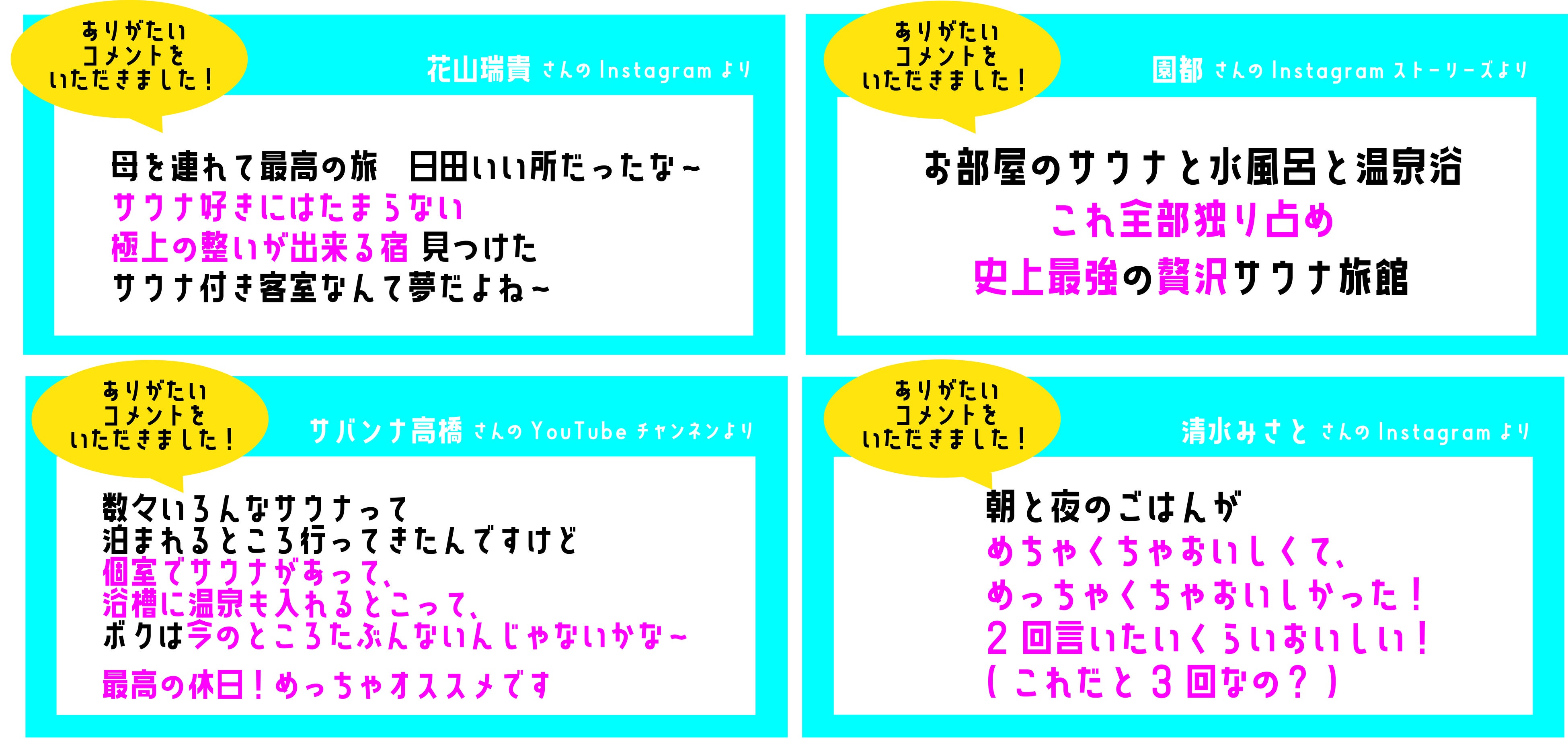 ご宿泊いただいたサウナ好き芸能人の方々からのコメント