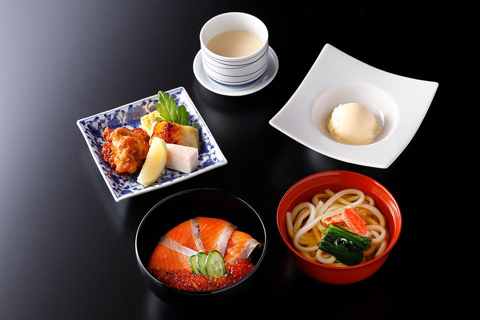 焼き物盛り合わせ、豆乳玉地蒸し、鮭といくら丼、温うどん、バニラアイスクリーム