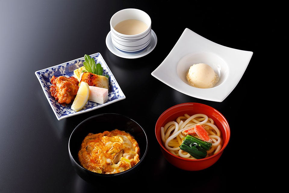 焼き物盛り合わせ、豆乳玉地蒸し、玉子丼、温うどん、バニラアイスクリーム