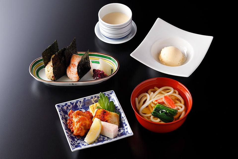 焼き物盛り合わせ、豆乳玉地蒸し、おにぎり2種(昆布と鮭)、温うどん、バニラアイスクリーム