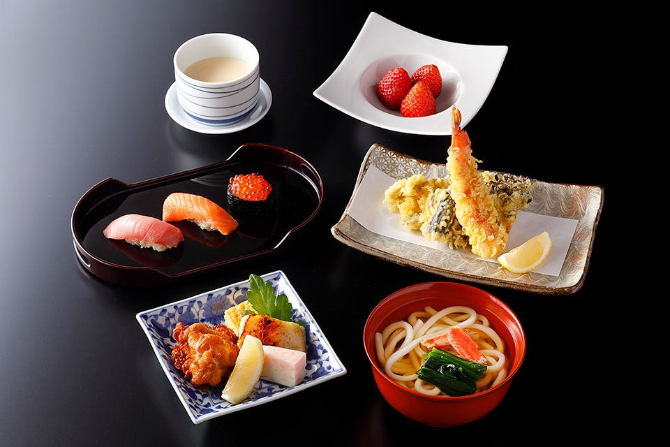 焼き物盛り合わせ、豆乳玉地蒸し、天婦羅、にぎり寿司(3種)、温うどん、フルーツ