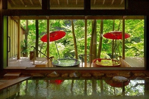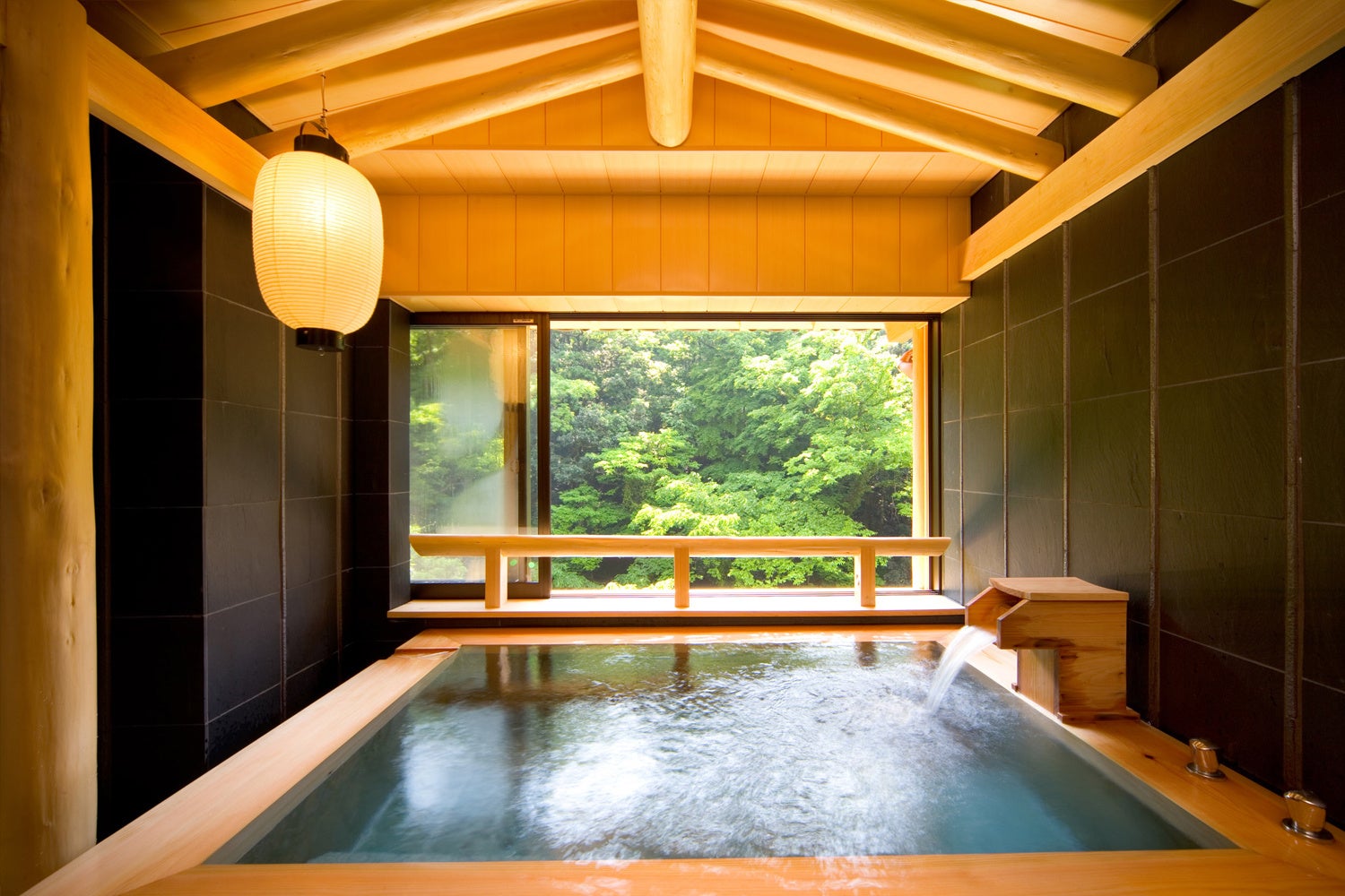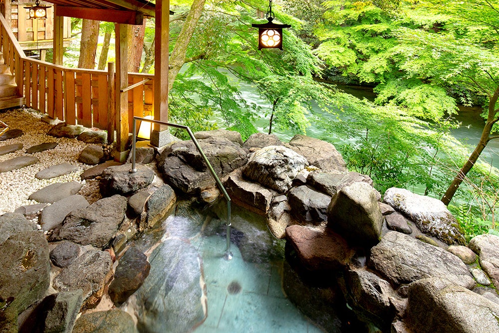 檜造りと岩造り、趣が異なる二種の貸切風呂は、鶴仙渓の絶景と天然温泉を独占する極上空間。