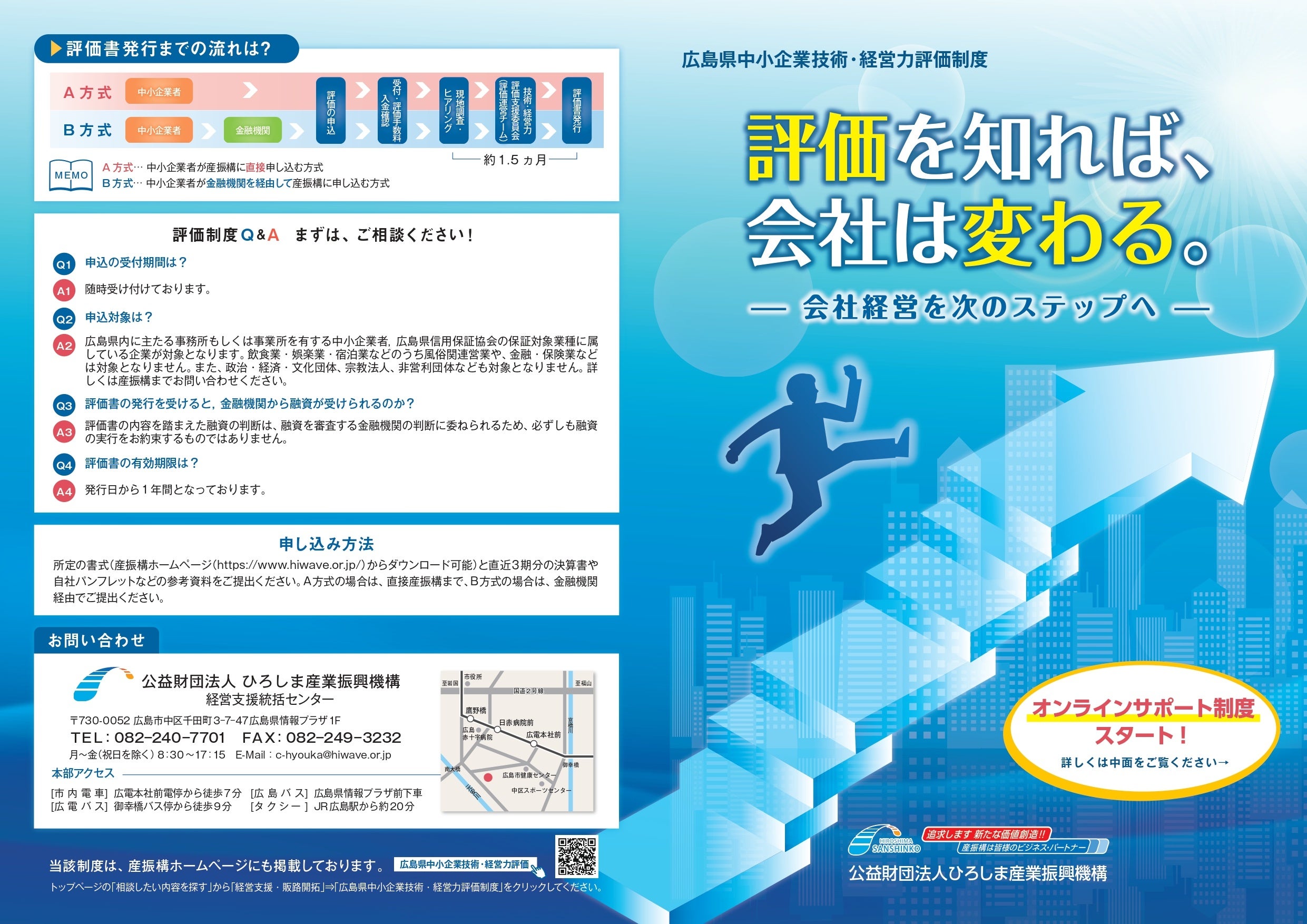 広島県中小企業技術・経営力評価制度とは、財務諸表に表れない自社の優れた事業価値を評価します。技術力やノウハウ(ビジネスモデルを含む)をはじめ、成長性・経営力を記載した評価書を作成し、公的機関である(公財)ひろしま産業振興機構(産振構)が発行します。取引先へのPRや金融機関からの資金調達等に活用でき、また評価によって明らかになった課題の解決に向け、産振構などの他の支援メニューをご提案させていただき、課題解決に向けて支援いたします。参考URL: https://www.hiwave.or.jp/purpose1/development/evaluation/