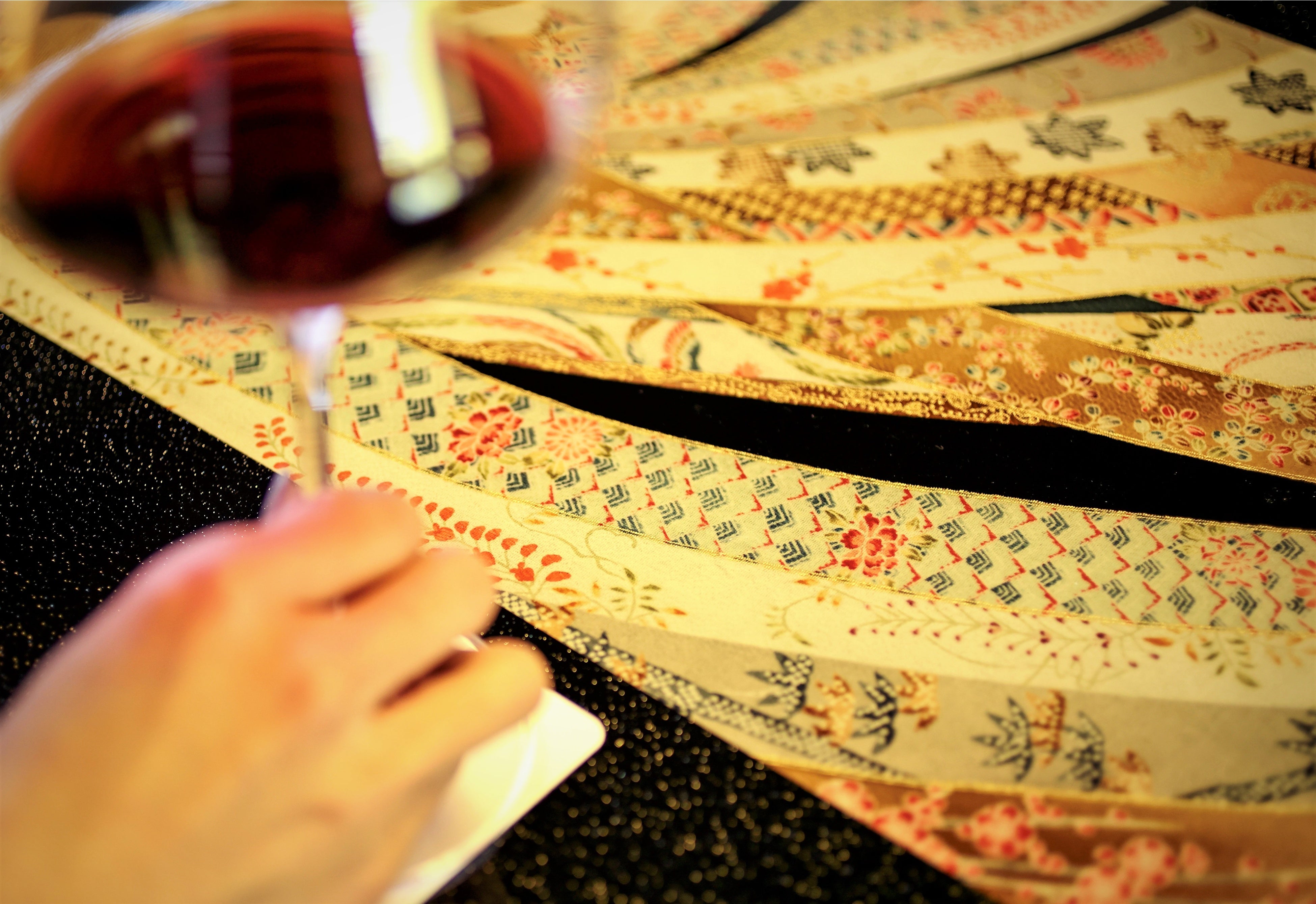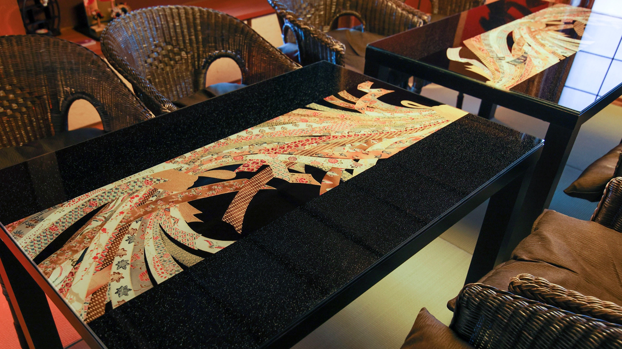 このたび個室のテーブルトップに、京友禅の着物づくりを手がける木村染匠株式会社とのコラボで、「京友禅硝子」のテーブルトップがお目見えしました。