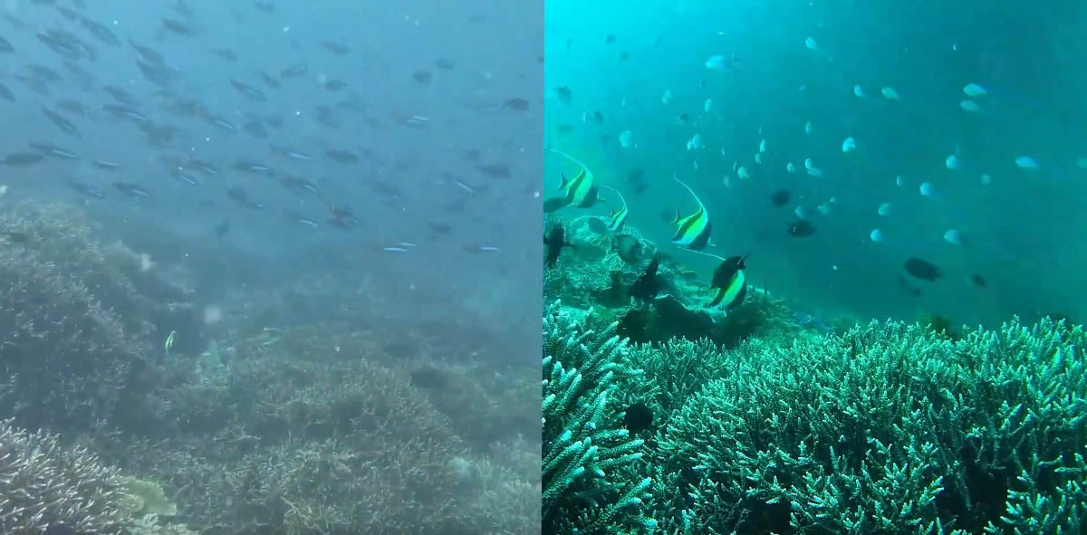 QYSEA独自のAI技術を駆使し、水中映像独特の青みがかった色合いを補正することができます。また、映像の彩度や明度を調整することで、より鮮やかで美しい色合いを表現することが可能です。(画像左側が補正後)