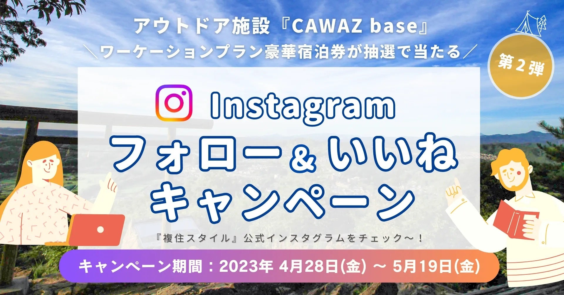 本取り組みは和歌山県白浜町に続き、ワーケーション無料宿泊券が提供される期間限定キャンペーンの第2弾となります。参加は2023年04月28日(金)10:00〜2023年05月19日(金)23:59の期間限定で、本キャンペーンは【複住スタイルのInstagramをフォロー / 投稿にいいねした方が対象】となっております。是非、お気軽にご登録ください。