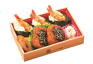 三重県名張市の日本料理店「蔵楽」から、三重県津市が発祥といわれるご当地グルメ・天むすの弁当が登場。尾鷲のガス海老を使用した天むすと三重県産美稲豚ヒレカツを特製胡麻味噌で味噌カツに仕上げた弁当です。