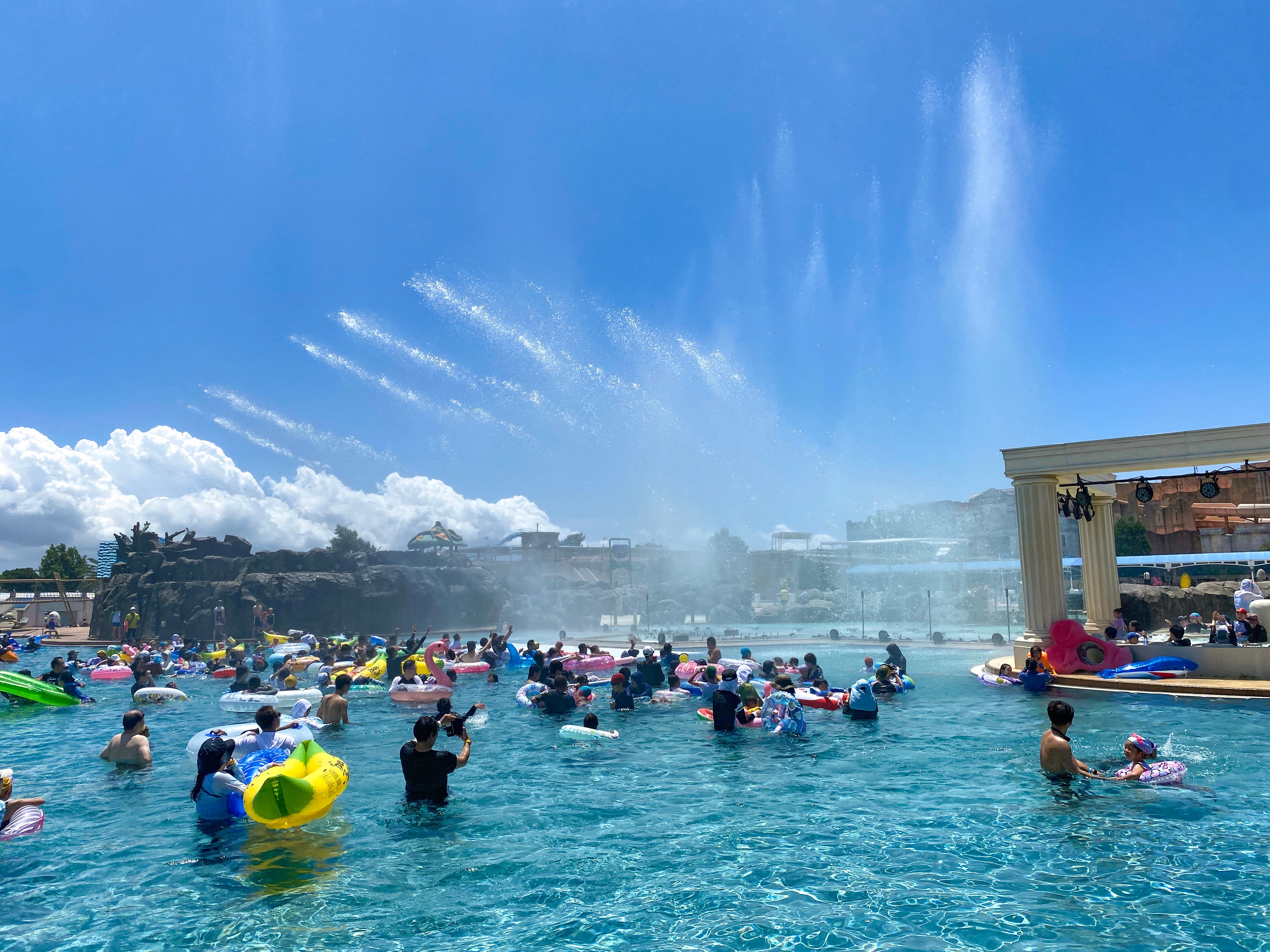 大人もお子様も楽しめるラグナシア定番の全長230mの流れるプール「ウロボロスの河」や最大波高1mと日本最大級の高さを誇る波の出るプール「ジョイアマーレの浜辺」など全6種類のプールが楽しめます。