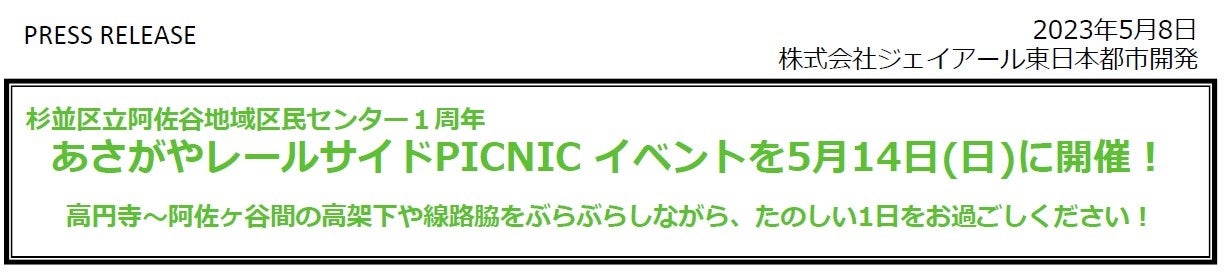 ジェイアール東日本都市開発では、阿佐ヶ谷・高円寺エリアの方に「歩きたくなる高架下」と感じていただけることを目指し、「阿佐ヶ⾕・高円寺プロジェクト」という活動を続けています。このたび、2023年5月14日(日)に地域のみなさまにまちを巡って楽しんでいただくために、地域のみなさまとともに各会場の使い方を考えて企画した、「杉並区立阿佐谷地域区民センター1周年 あさがやレールサイドPICNIC」を開催いたします。合わせて、アルーク阿佐ヶ谷では子育て世代に向けたイベント「ふれあい動物園」を開催いたしますのでご案内いたします。