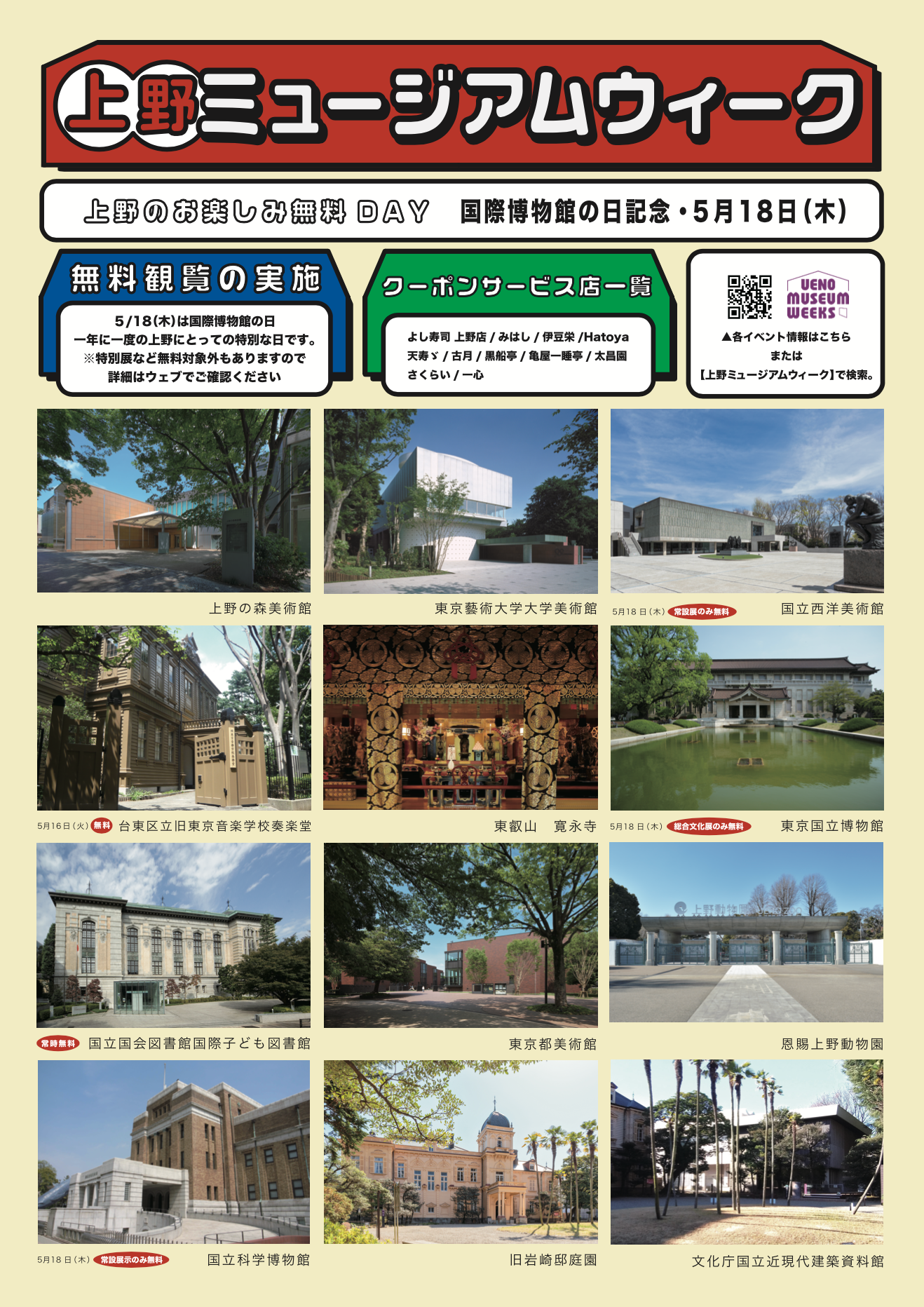 毎年“国際博物館の日(5/18)”とその前後に、美術館や歴史的文化施設などが集まる上野エリアで開催される「上野ミュージアムウィーク」。今年は、5月6日(土)から5月28日(日)まで、上野恩賜公園周辺にある博物館や美術館、動物園など12施設と、上野のれん会の加盟店が参加して行われます。