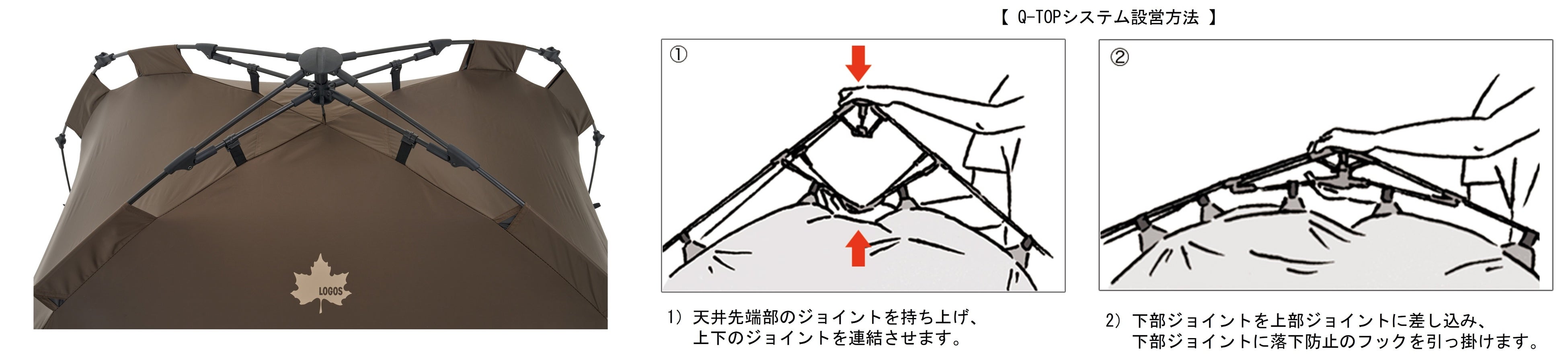 LOGOS独自の「Q-TOP SYSTEM」により、約30秒で設営が完了。折り畳まれたフレームを伸ばしてロックするだけなので、組立ても撤収もスピーディー。さらに、フレームと生地はあらかじめ一体化しているため、パーツを紛失する心配なし。