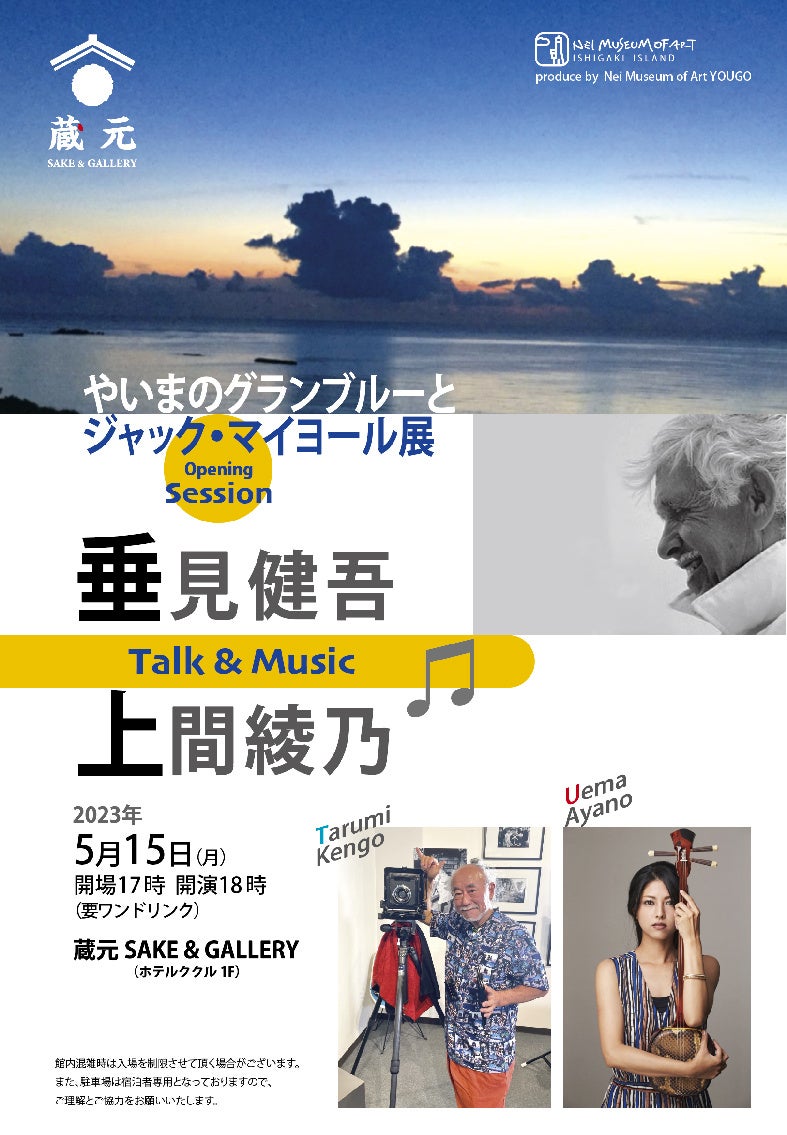 シマダグループの一社であるタイム・アロー八重山株式会社(沖縄県石垣市 代表取締役:中川 和紀)が運営をする石垣島ホテルククル1階の“蔵元SAKE&GALLERY”にて5月15日~垂水健吾 やいまのグランブルーとジャックマイヨール展を開催いたします。写真展示を記念し、5月15日には垂水健吾×上間綾乃のオープニング・セッション トーク&ミュージックを開催いたします。