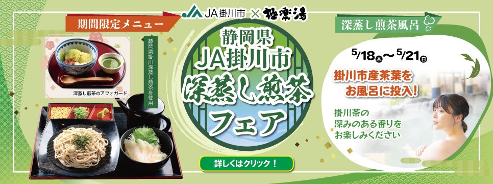株式会社極楽湯(本社:東京都千代田区、代表取締役社長:新川 隆丈)は、JA掛川市とのタイアップイベント「深蒸し煎茶フェア」を実施します。2023年5月15日(月)~お食事処で深蒸し煎茶メニューの販売、5月18日(木)~掛川市産生の深蒸し煎茶を使用した「深蒸し煎茶風呂」を開催します。