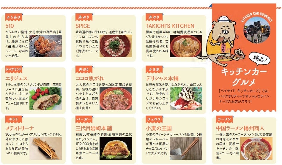 ☞人気のキッチンカーが、ベイサイドを埋め尽くします。春にふさわしい多岐にわたるグルメが勢揃いします。