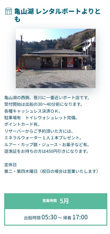 店舗の地図や出船時間、最近の店舗利用バサーの釣果など、店舗ごとにバサーが欲しい詳細な情報が掲載されているので、店舗への問合せが不要です。