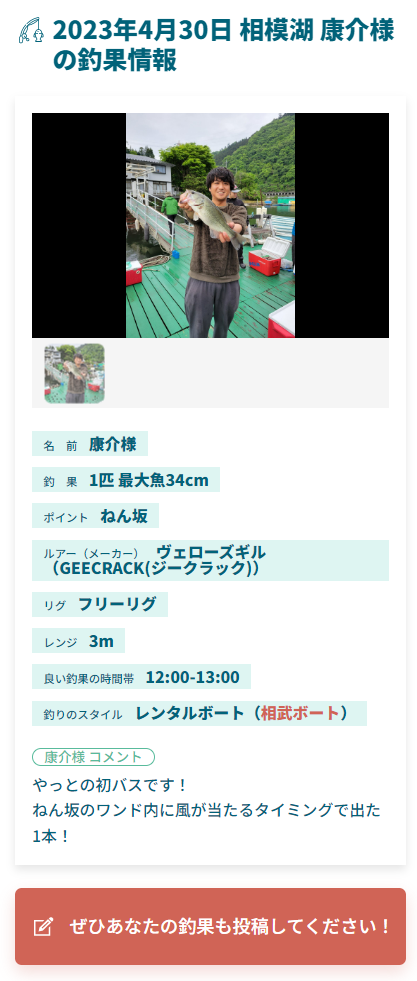 まとまった釣果情報をバス釣りに特化した項目で確認できるので、釣行前のタックル選びの参考になります。