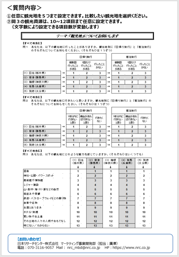 日本リサーチセンターが提供する「観光地国内需要調査」では、国内観光地5ヵ所の需要を測定した上で、需要を拡大するためのターゲットと訴求すべき観光資源をフレームワークで調査結果を整理します。