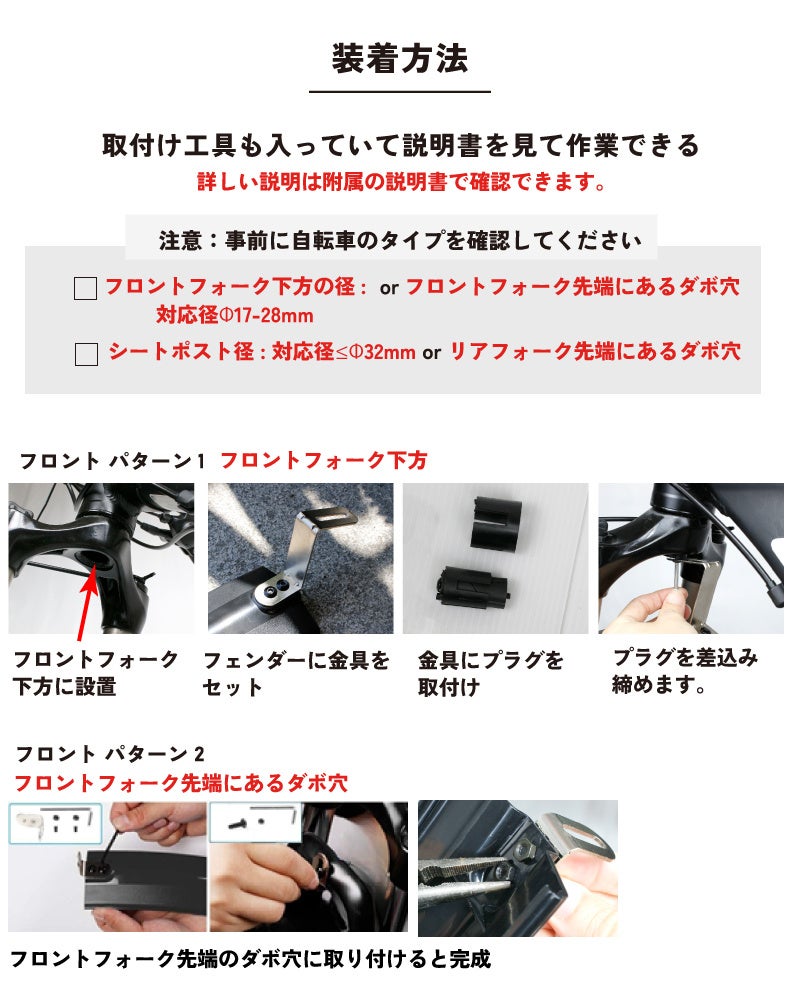 フロントフェンダー:フロントフォーク下方の径(対応径Φ17-28mm)orフロントフォーク先端にあるダボ穴 |