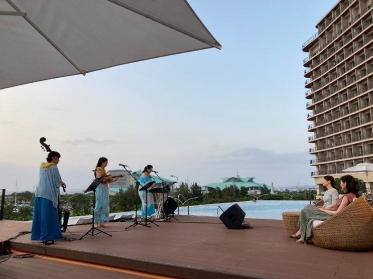 沖縄の音楽や踊りをインフィニティプールサイドに加え、