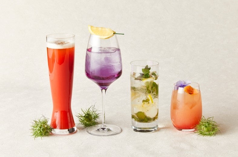 宮崎産フレッシュマンゴーのピューレと唐辛子が入ったリキュールを使用し、ピンクペッパー、八角、シナモンを飾りに付けた、夏にぴったりのスパイシーなカクテル「ヘブンリーベッド – オリエンタルスパイシーマンゴー」と、神奈川県泉橋酒造のサスティナブルな焼酎「あますことなく」をベースにした白桃のカクテル「白桃クーラー」をご用意いたします。