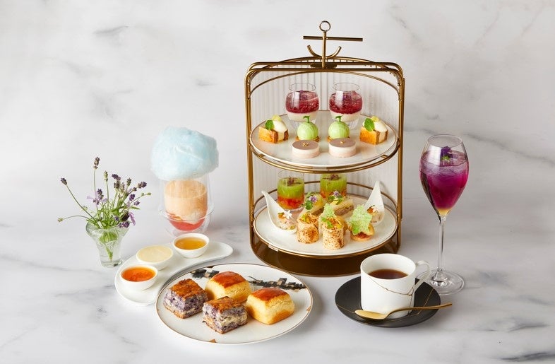 23階ロビーラウンジでは、贅沢な夏の風味をお楽しみいただけるアフタヌーンティーとして「ラベンダーとメロンのアフタヌーンティー」をご用意いたします。メロンでコーティングしたラベンダーと生ハムのムースを加えた「生ハムメロン」、「スモークサーモンと焼きパイナップルのロール ラベンダー味噌クリームチーズ」などのセイボリーアイテムや、「メロンとココナッツのミルフィーユ」や「ラベンダーとライチのケーキ ラズベリーソース」など、ラベンダーが引き立てるメロンの爽やかなエッセンスをお楽しみください。ウェルカムモクテルとして、ブルーベリーとラベンダーを紅茶で割った美しいパープルのドリンク「サマーラベンダー」をご用意しています。土日・祝日には「メロンとローズのソーダ」をお付けいたします。
