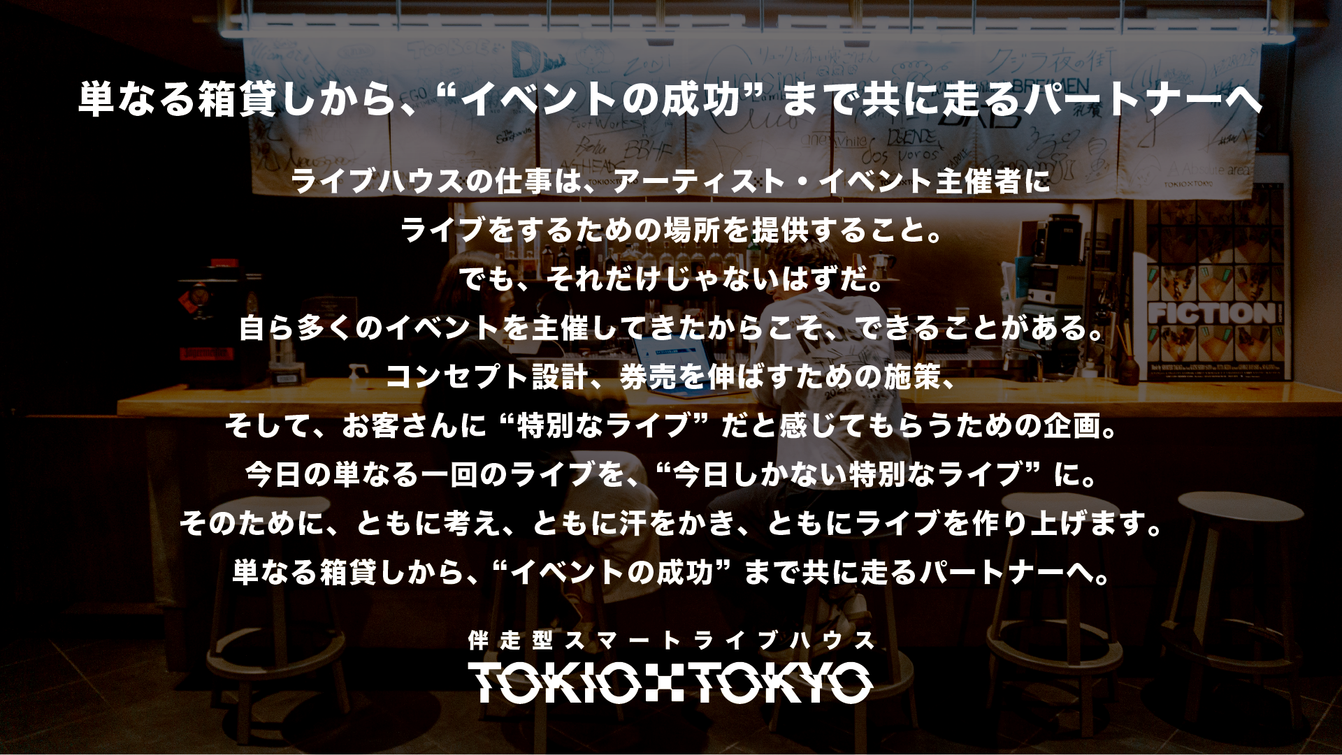 「動員ができるか不安」「ワンマンライブはまだ先かな…」といったような不安を抱えるアーティスト様や事業者様でも、安心して「まずは相談できるライブハウス」として、”伴走型スマートライブハウス”『TOKIO TOKYO』は尽力して参ります。