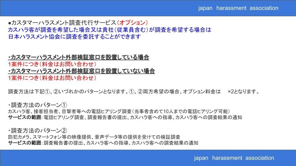カスハラ客が調査を希望した場合又は貴社(従業員含む)が調査を希望する場合は日本ハラスメント協会に調査を委託することができます
