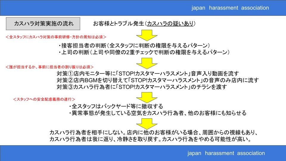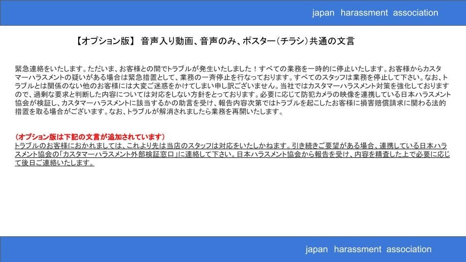 トラブルのお客様におかれましては、これより先は当店のスタッフは対応をいたしかねます。引き続きご要望がある場合、連携している日本ハラスメント協会の「カスタマーハラスメント外部検証窓口」に連絡して下さい。