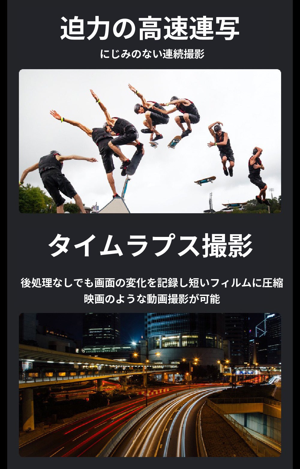 高速連写やタイムラプスで臨場感や空間を感じる撮影を