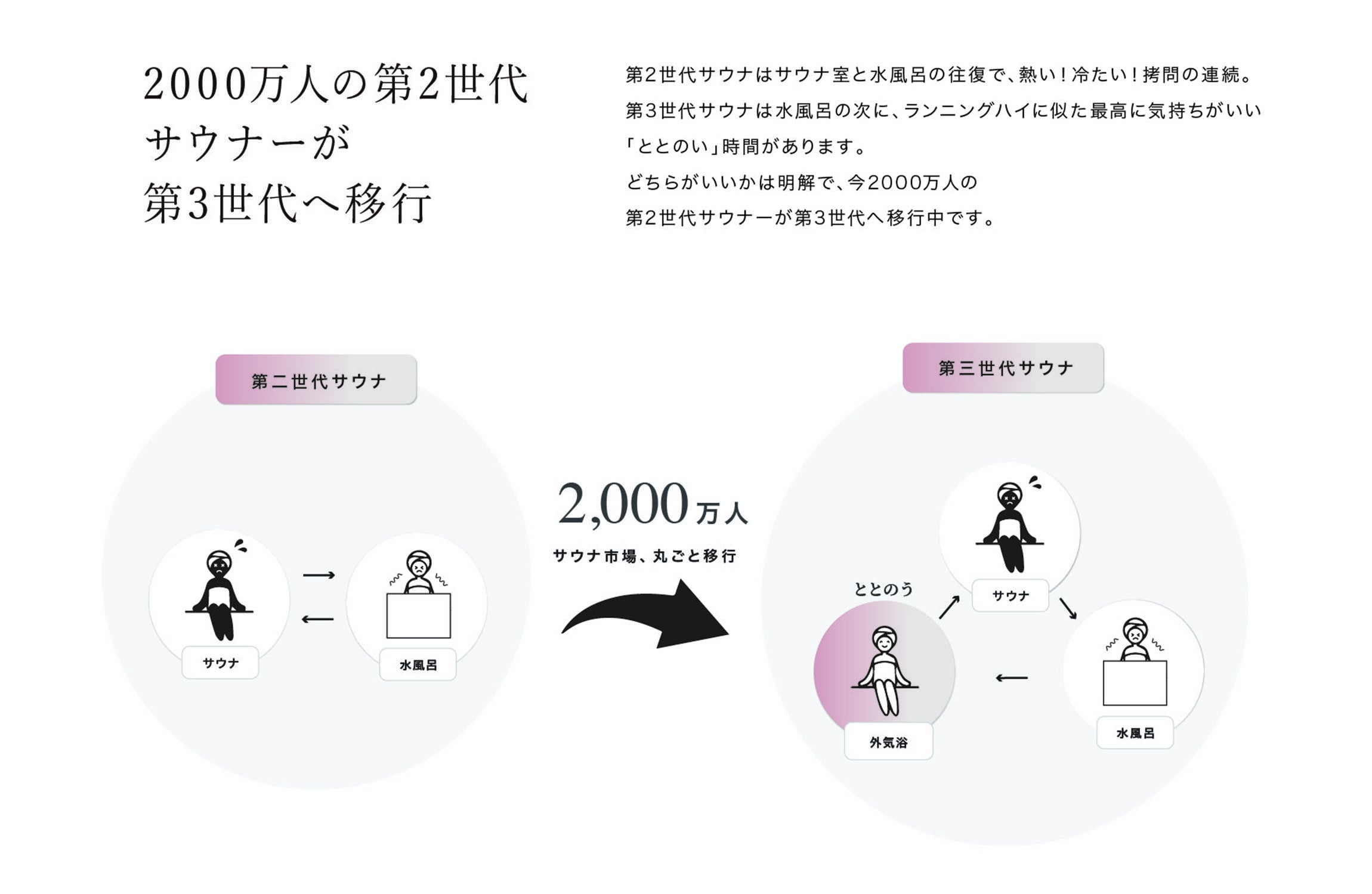 第2世代サウナはサウナ室と水風呂の往復で、熱い!冷たい!拷問の連続です。第3世代サウナは水風呂の次に、ランニングハイに似た最高に気持ちがいい’ととのい‘’時間があります。 どちらがいいかは明解で、今、2000万人の第2世代サウナーが第3世代へ移行中です。