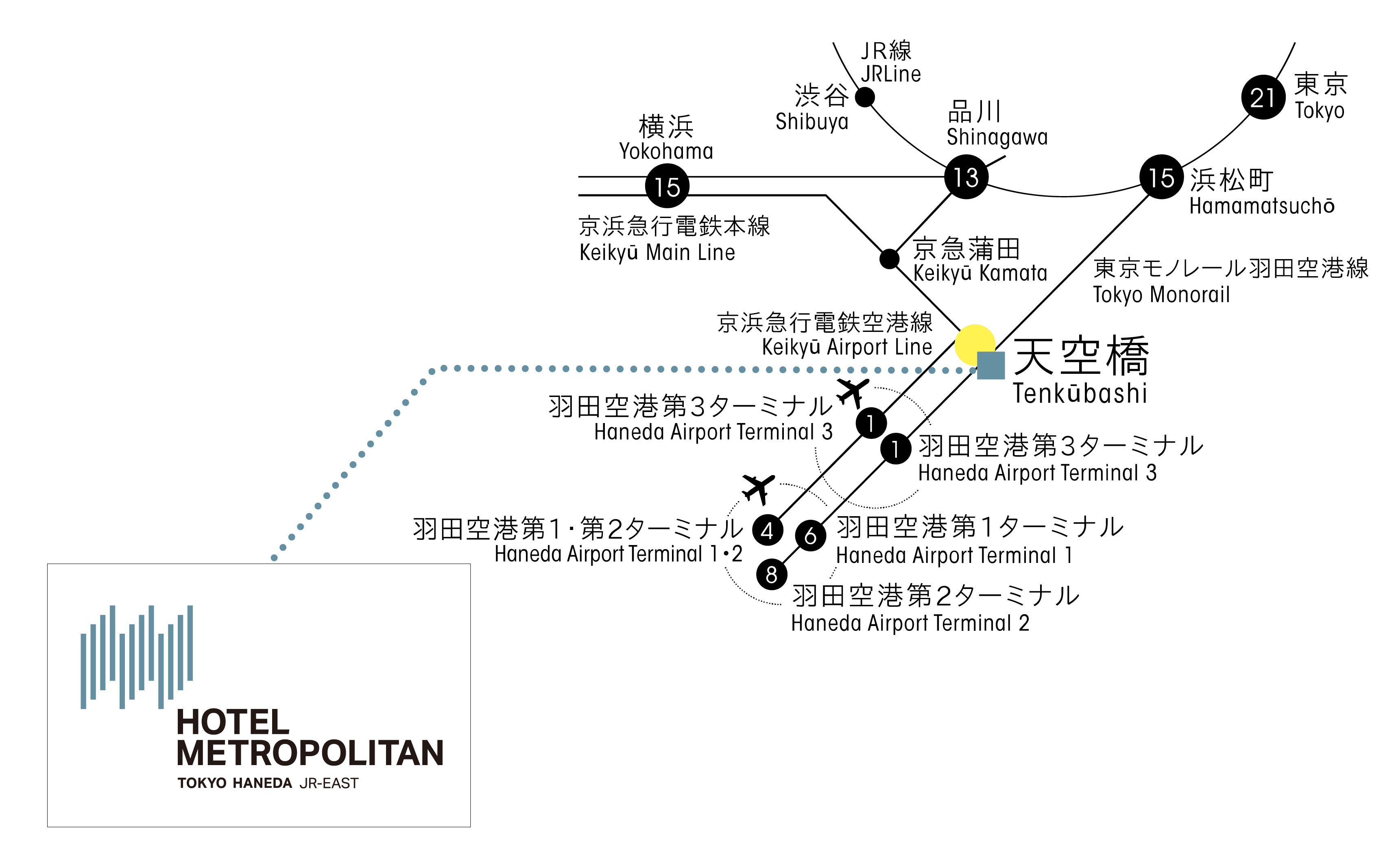 「ホテルメトロポリタン 羽田」は、羽田空港第3ターミナルから東京モノレール羽田空港線または京浜急行電鉄空港線で1駅の天空橋駅HICity口改札より徒歩約1分に位置し、空港へのアクセスはもちろん、東京、品川、横浜エリアにも近く、国内外のビジネスやレジャーの起点に最適な立地です。全13種類の客室と、付帯施設として屋上展望デッキ、レストラン、ジムなどをご用意します。“旅に寄り添う、おもてなし”をテーマに、旅の途中で翼を休め、英気を養って次の行き先に笑顔で飛び立てる「とまり木」のようなホテルを目指します。