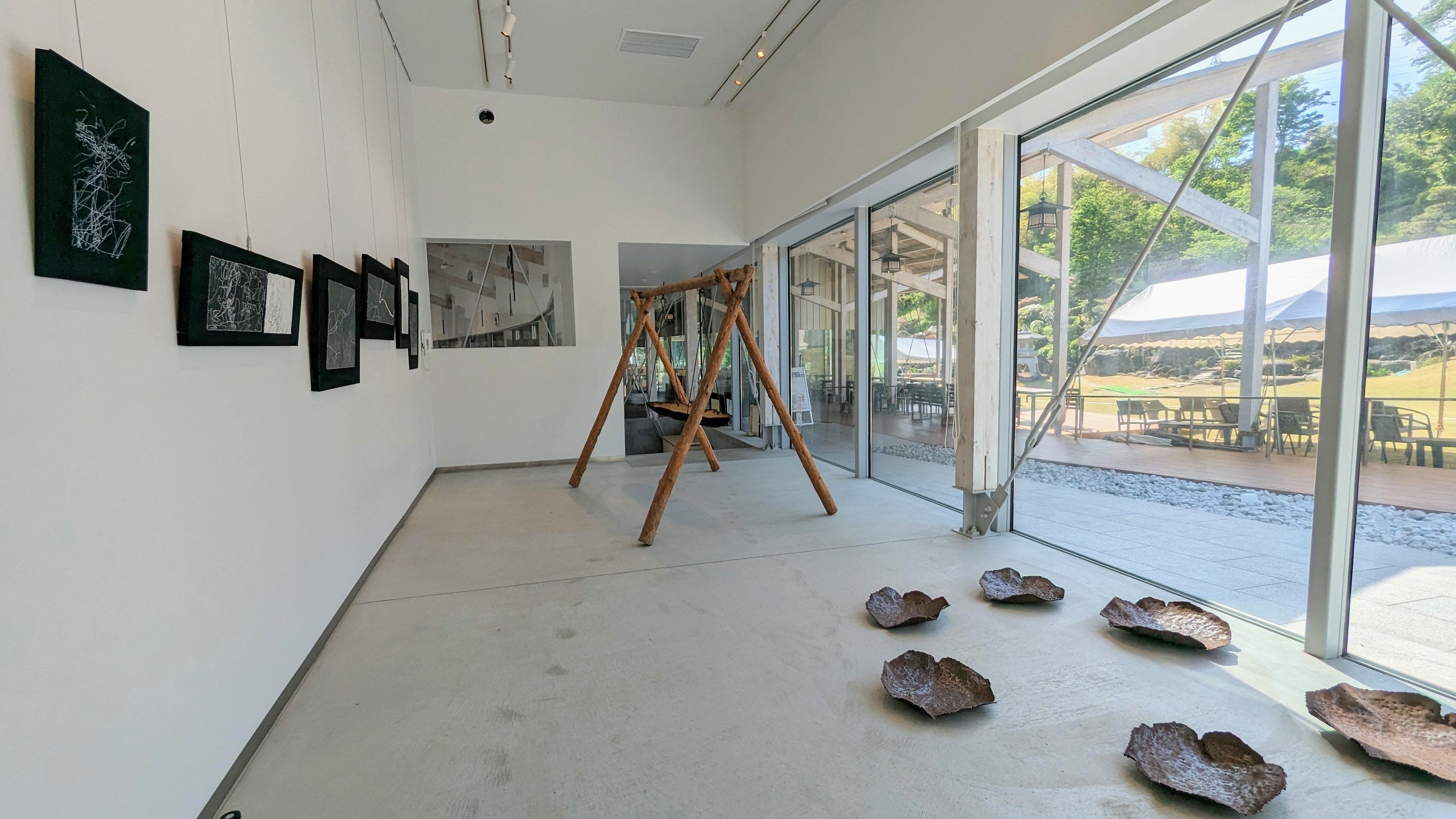 床には、鉄板を叩いてつくられた花とも葉とも見えるかたち。一方、荒く組まれた木組みからは、小舟のようなかたちが吊り下げられています。よく見ると、それは丸太の内側をくり抜かれてつくられており、裏側は黒く焼け焦げています。「風」や「水」は、一体どこにあるのでしょうか。