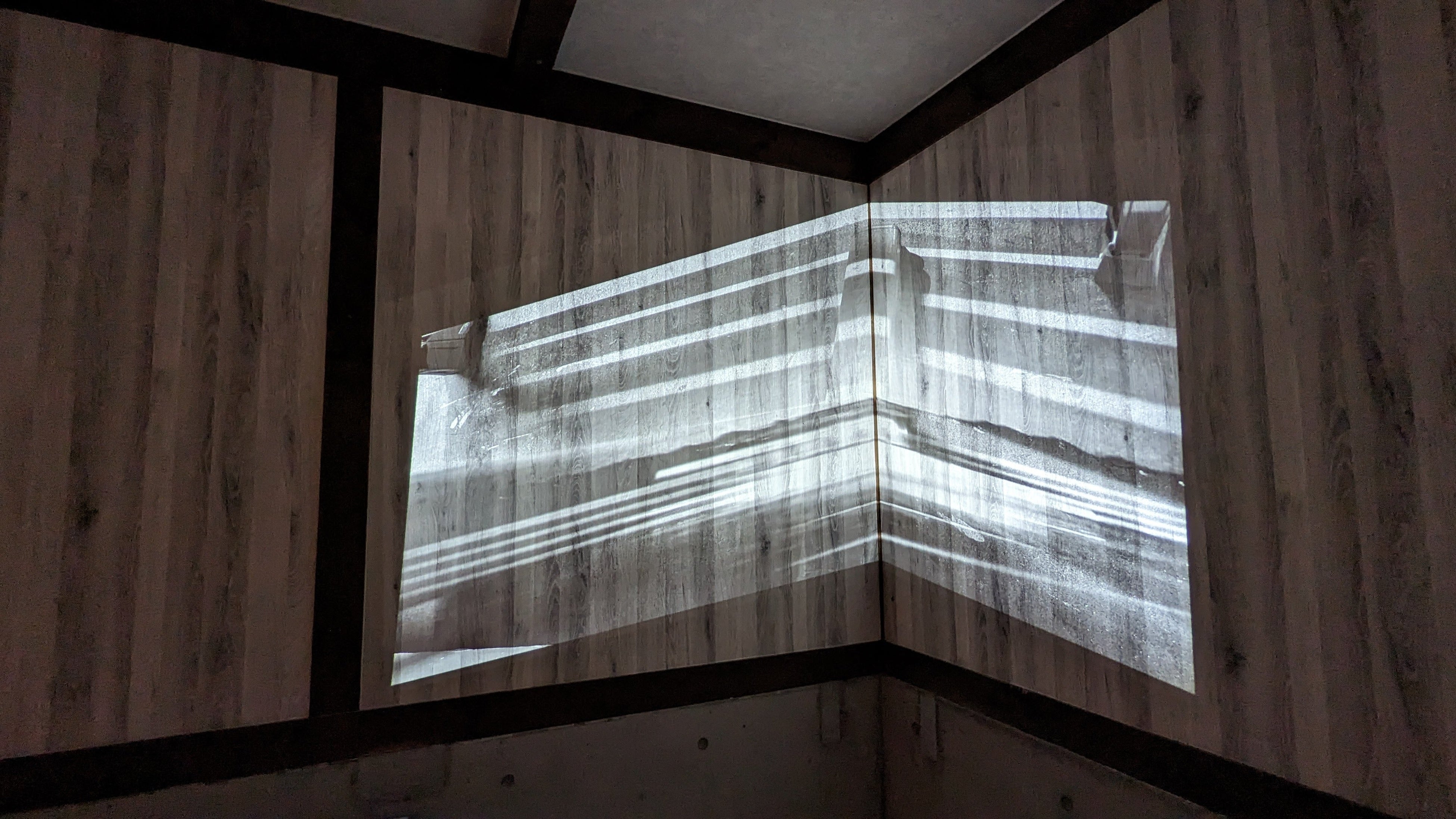 中に入って扉を閉じると、まず間断なく流れる瞑想的な音響に身体を包まれます。ベンチに座って部屋の角に投影される白黒の映像を見ていると、複数の画像と壁の木目が重なり、不思議な風景が立ち現れます。やがてカーテンから漏れる光まで、作品の一部に感じられてくるかもしれません。