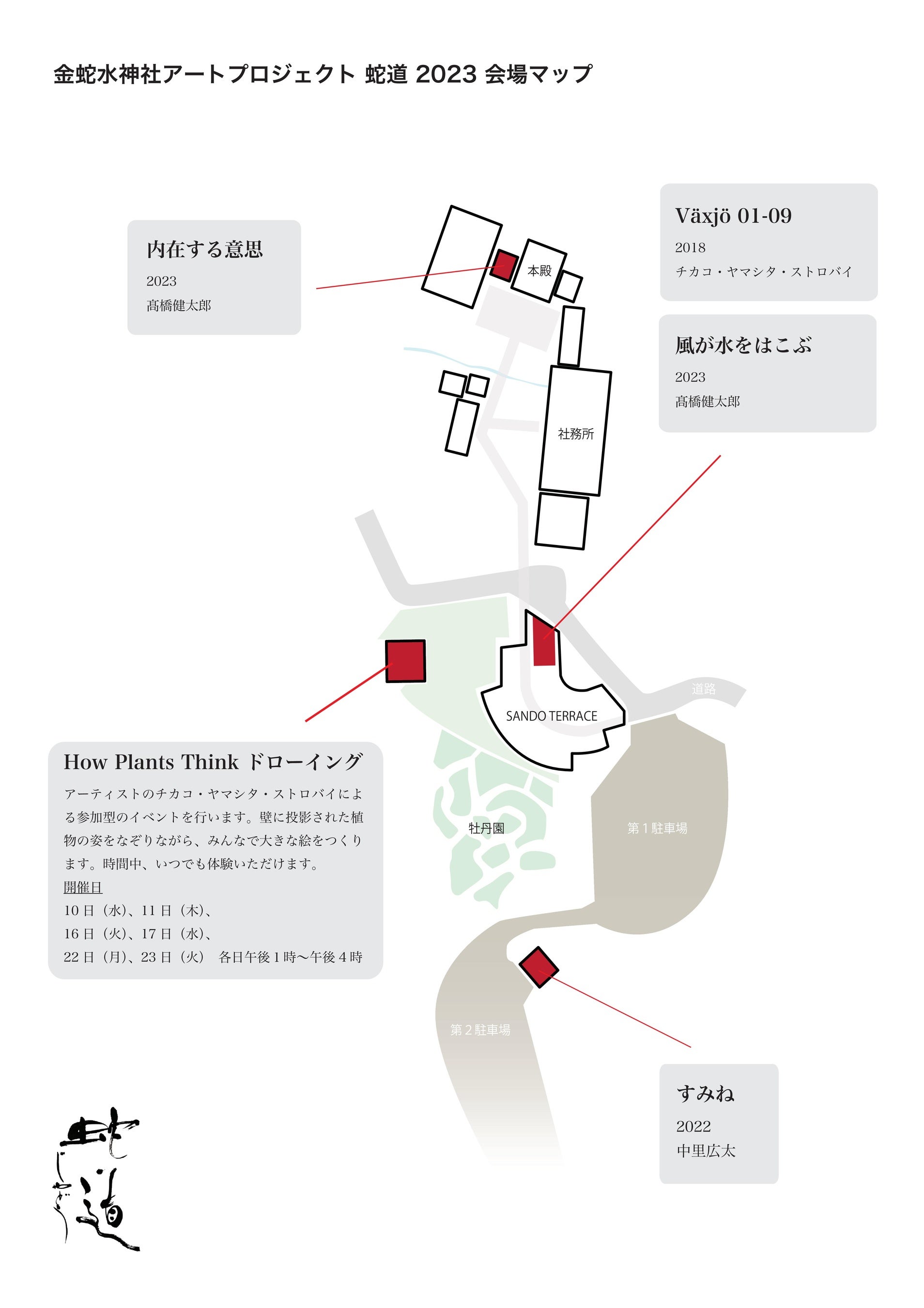 神社現代アート展「蛇道じゃどう」は昨年令和4年秋に続く2回目の開催です。次回は本年秋に『蛇道 R5 Autum 』を開催し、「How Plants Think ドローイング」で完成した絵画の展示なども行う予定です。