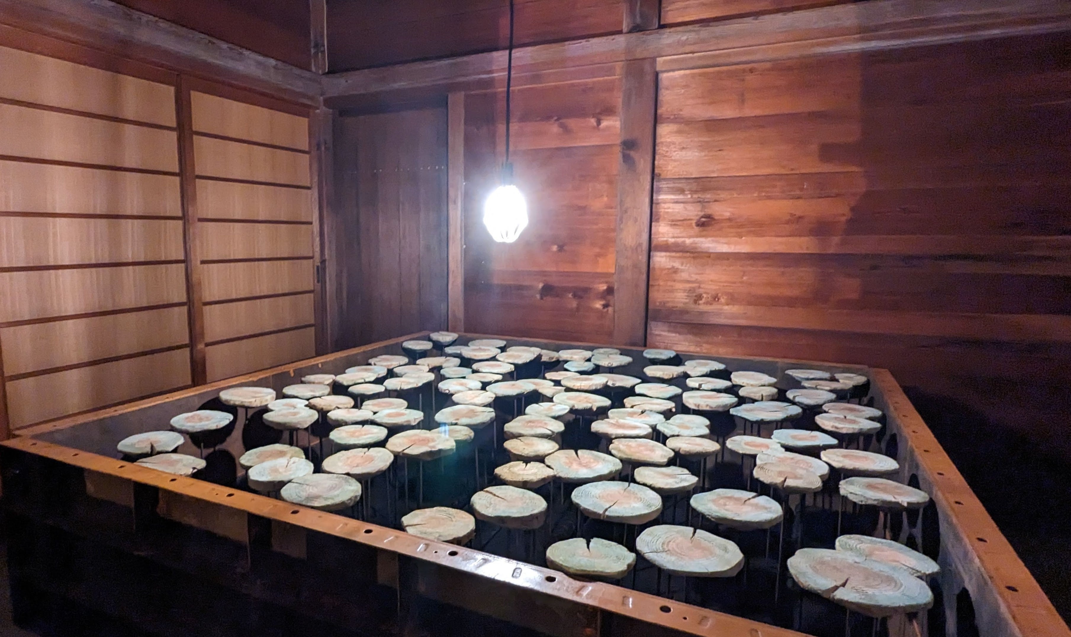 授与所の中に組まれた金属の枠の内側には、丸太を加工したかたちがおよそ水平に並んでいます。電球の光に照らされた丸太の表面を目で追うと、やがてその下にも空間が広がっていることに気がつくかもしれません。暗く満たされている内側の空間の上に、平たい丸太がゆらりと浮いているようにも見えます。