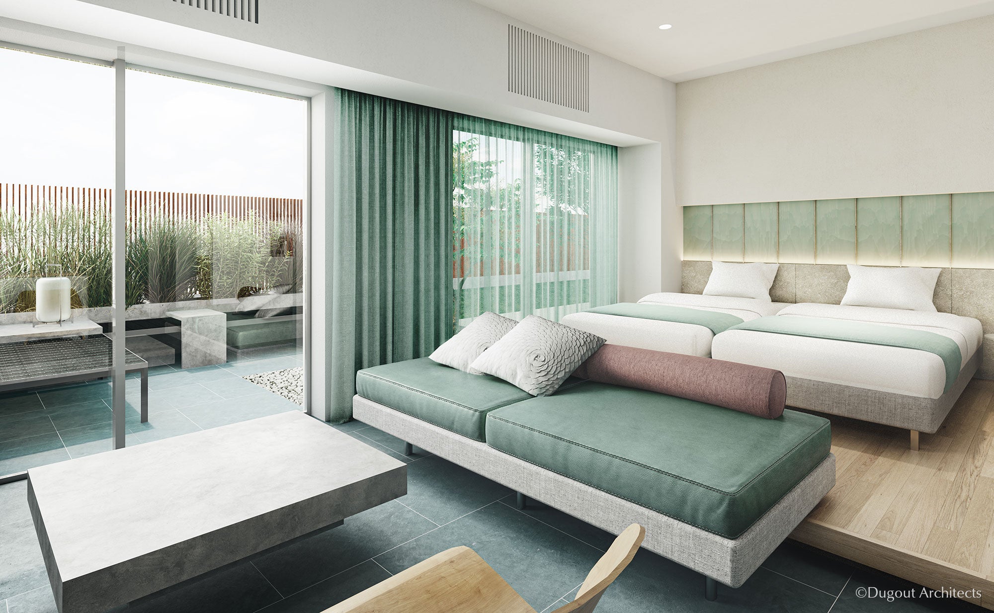 いとまち滞在を気軽にたのしめるHOTELタイプ、贅沢に過ごすVILLAタイプから構成される2つのタイプをご用意しました。バリエーション豊かな客室は、お一人様からご家族・グループ旅行、そしてサイクリストなど多様なニーズに合わせた滞在が可能です。HOTELタイプは、愛媛県内で産出される伊予青石の繊細な色をキーカラーとしたインテリアで、いとまち滞在を気軽にたのしめるスタイル、VILLAタイプは全室露天風呂の温泉付きの離れの構成となっており、旅館を現代的に解釈した上質なプライベート空間で特別ないとまち滞在をたのしめる客室となっています。