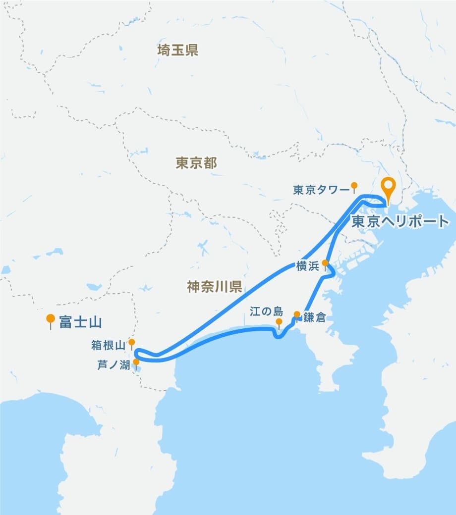 大満足の90分フライトでは、富士山だけでなく、東京タワーやレインボーブリッジ、横浜ランドマークタワー、江の島といった観光名所を、上空からお楽しみいただけます。