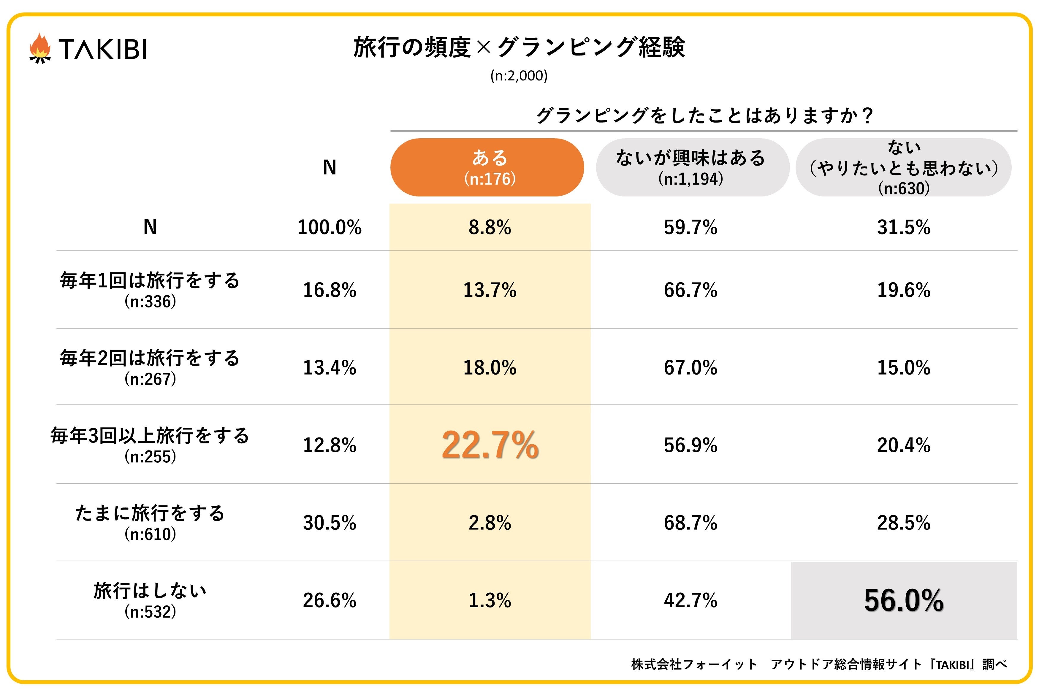 旅行の頻度と、グランピング経験の掛け合わせで見たところ、「グランピングをしたことがある」と回答した人は「毎年3回以上旅行をする」人に最も多く、22.7%となりました。