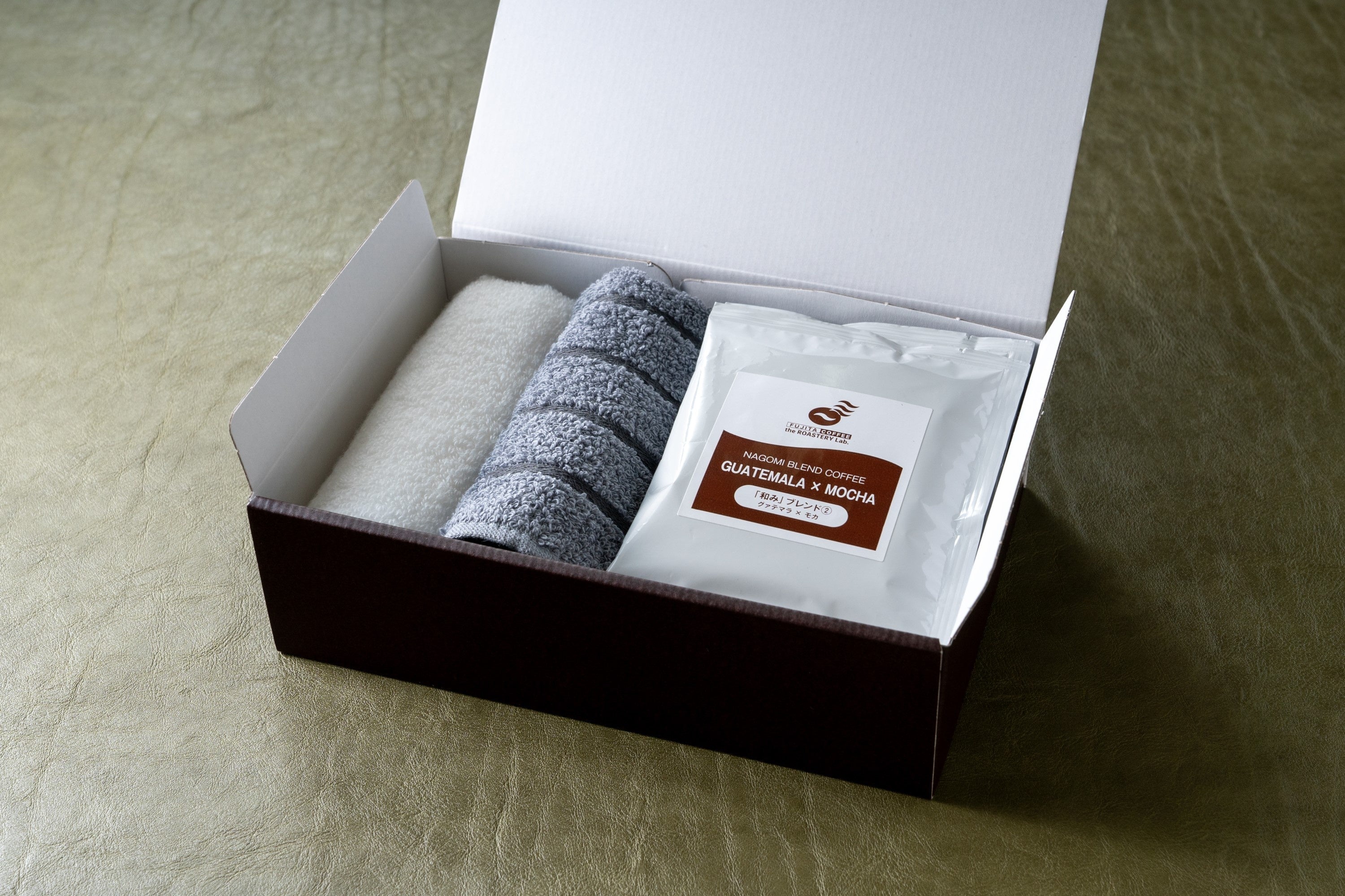 また、タオルハンカチ単品での販売に加え、1963に創業し、大阪府東大阪市に拠点を構える藤田珈琲株式会社の深みあるブレンドのドリップコーヒー5袋を詰め合わせた、ギフトにもお使いいただけるセットをオンラインショップにてご用意します。