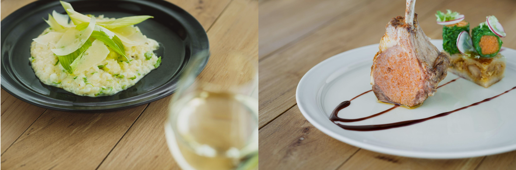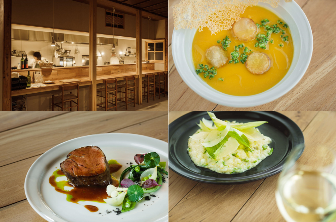 1階のレストランawaiでは、戸隠・長野の食材を活かした、ここでしか味わえないオリジナルフレンチをご提供します。また入手が難しい長野産のワインや日本酒、シードル(りんごのスパークリングワイン)などもご用意しております。戸隠山の麓に広がる戸隠高原は標高1,200メートルに位置し、昼夜の寒暖差と清らかな水によって育まれる質の高い食材が多くあります。甘みのある高原野菜を中心に山菜、「戸隠そば」で有名なそば粉、ジビエ、川魚などをシンプルに調理し、素材の良さを引き立てます。