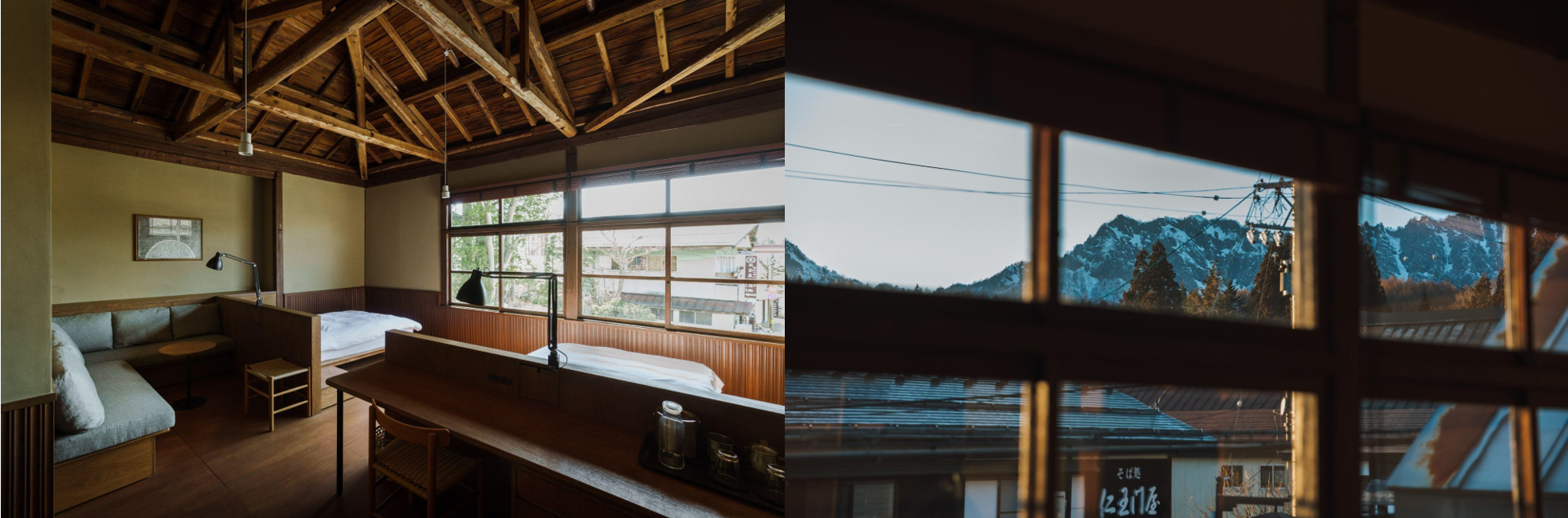 装飾性を極力廃し、もともとの木造建築の美しさを引き出し、空気感や間を大切にすることで、戸隠の自然や自身、大切な人と向き合えるミニマルな空間に。レストランと客室には、戸隠山や鏡池をモチーフにした素朴なアートを飾り、客室からは、参道のまちなみと荘厳な山々を見晴らすことができます。