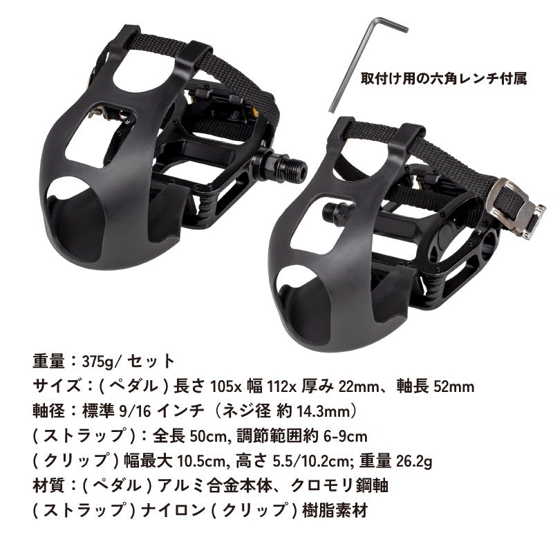 フラットペダル、トゥークリップ、ストラップ、取付け工具 |