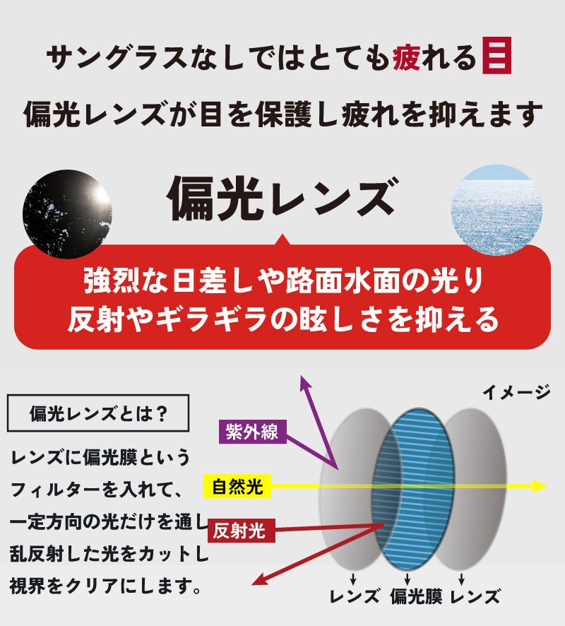 レンズに偏光膜というフィルターを入れて、一定方向の光だけを通す偏光レンズで
