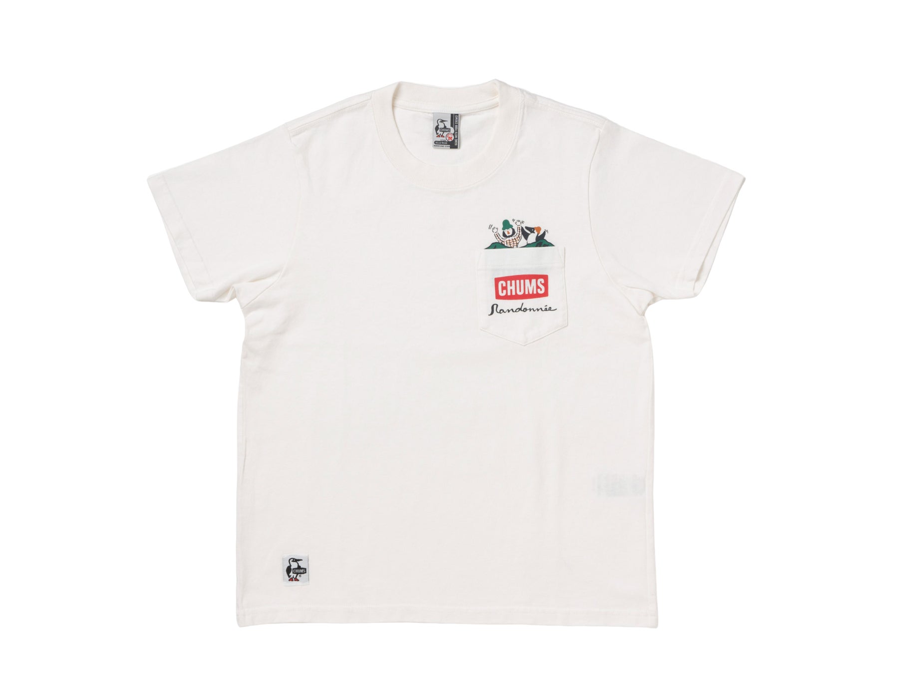 キャンプでのわくわくした気持ちを日常にも繋げたいという思いで制作したTシャツ。胸ポケットにはチャムスとランドネのロゴをあしらい、チャムスのマスコットキャラクターであるブービーバードと、ランドネのマスコットキャラクターであるアルプスのおやじムッシュが、山のふもとで楽しんでいるようすを描きました。