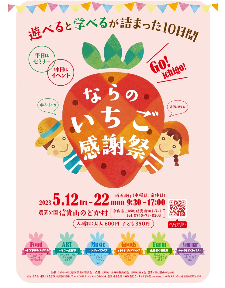 いちごの農学のプロ、いちごの農業のプロ、食のプロ、芸術学のプロ、公のプロ集団が、奈良県三 郷町の信貴山のどか村にぎゅっと凝縮いたします。入場料大人600円、子ども350円。初開催となる、ならの農業イベントですが、選りすぐりの盛りだくさんな内容となっています!!