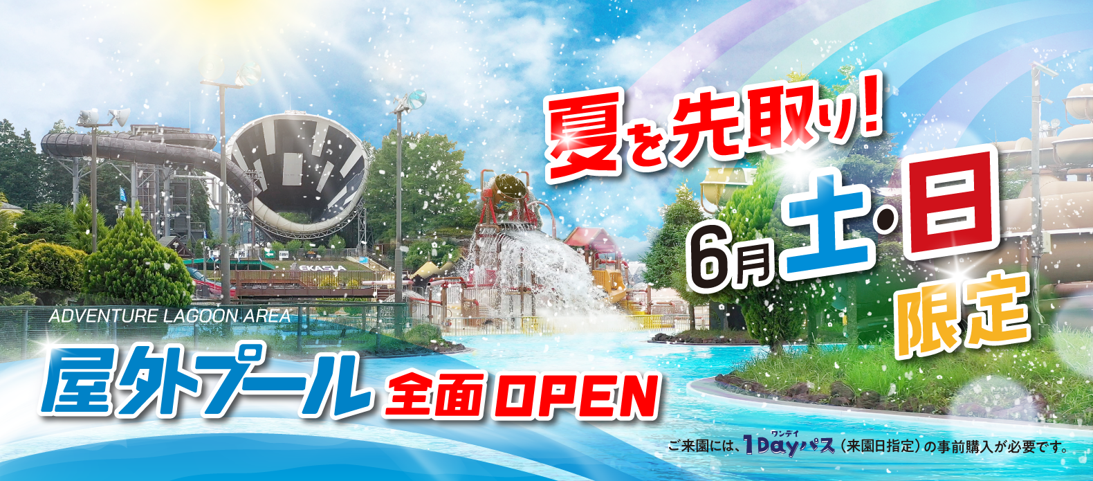 入園券とフリーパス券がセットの「1Dayパス」で遊園地も遊び放題、水と緑に囲まれた夏の冒険を何処よりも早くご満喫ください。