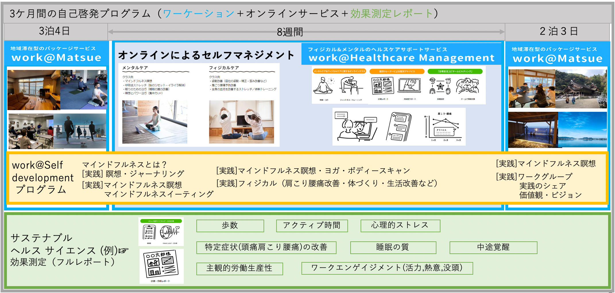 ワークアットでは、「地域との密なコミュニケーション・交流」「ストレスの見える化」「マインドフルネスによるセルフマネジメント」「セキュリティの安全性が担保された」の要素を盛り込んだ”松江式ワーケーション”を実践できる地域滞在型のパッケージサービス<work@Matsue>と、オンラインヘルスケアサポートサービス<work@Healthcare Management>を提供しています。